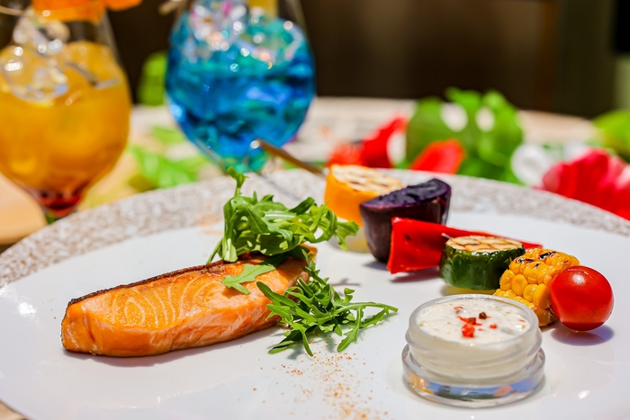Bコース:冷製スープ/ガーリックシュリンプ/サーモンのポワレ&季節野菜のグリル/シェイブアイス