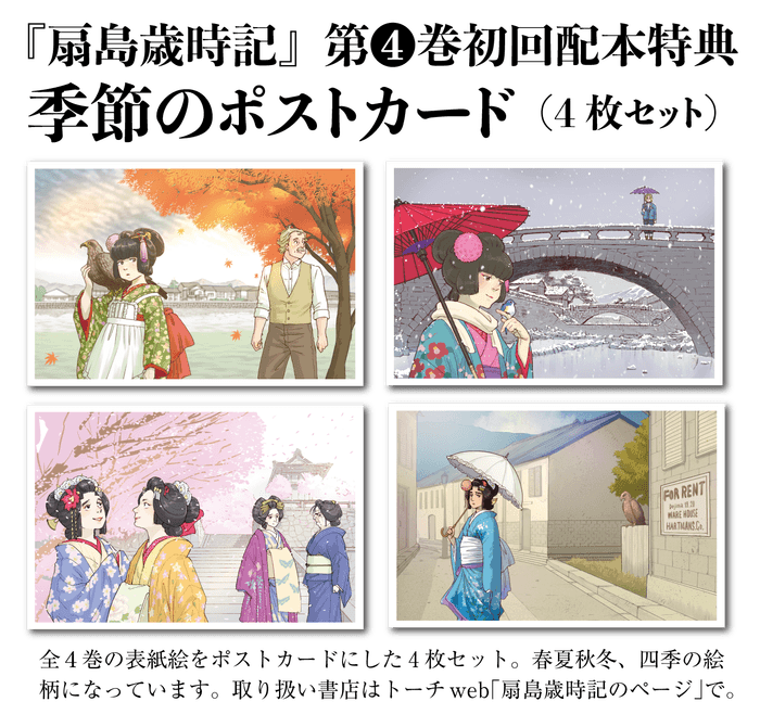 全4巻の表紙絵をポストカードにした4枚セット。春夏秋冬、四季の絵柄になっています。