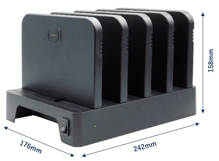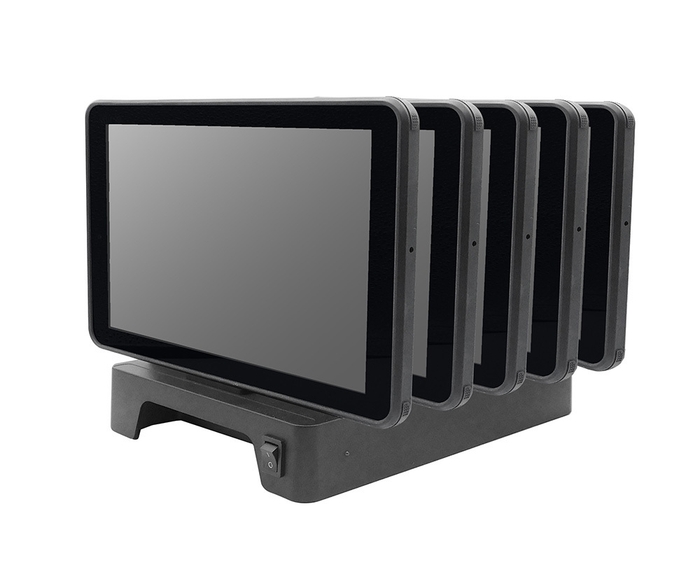 「5連式充電クレードル MPT-TC-ST2」は、タブレットジャケットを装着した状態で、最大5台まで同時に充電可能な5連チャージャーです。1台用の充電クレードルに比べ省スペースで、効率よく充電をすることができます。複数のタブレットを運用している店舗などでは、効率的な運用が可能になります。