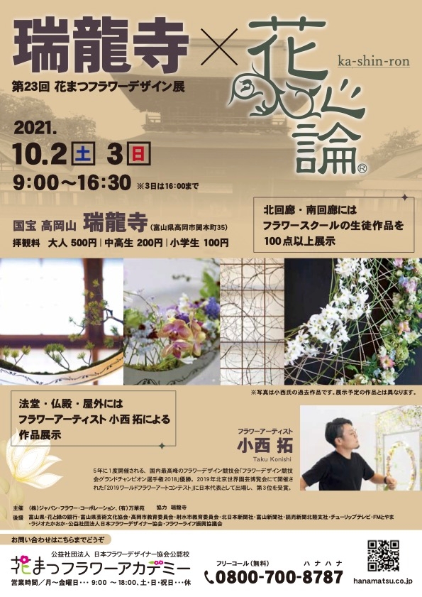 株式会社ジャパン・フラワー・コーポレーション(本社:富山県射水市、代表取締役社長:松村吉章)が運営する「花まつフラワーアカデミー」では、第23回花まつフラワーデザイン展『花心論2021』を、国宝 高岡山 瑞龍寺にて開催しました。『花心論』は、花まつフラワーアカデミースクールの生徒様の、日ごろの研鑽の発表の場であり、またフラワーアートのトップランナーを招いて、花から始まる豊かなライフスタイルを表現し、お伝えするべく1999年の初回より継続して開催しているお花の一大イベントです。生徒様からの数多くの作品も華やかに展示され、各方面からの受賞も発表されました。