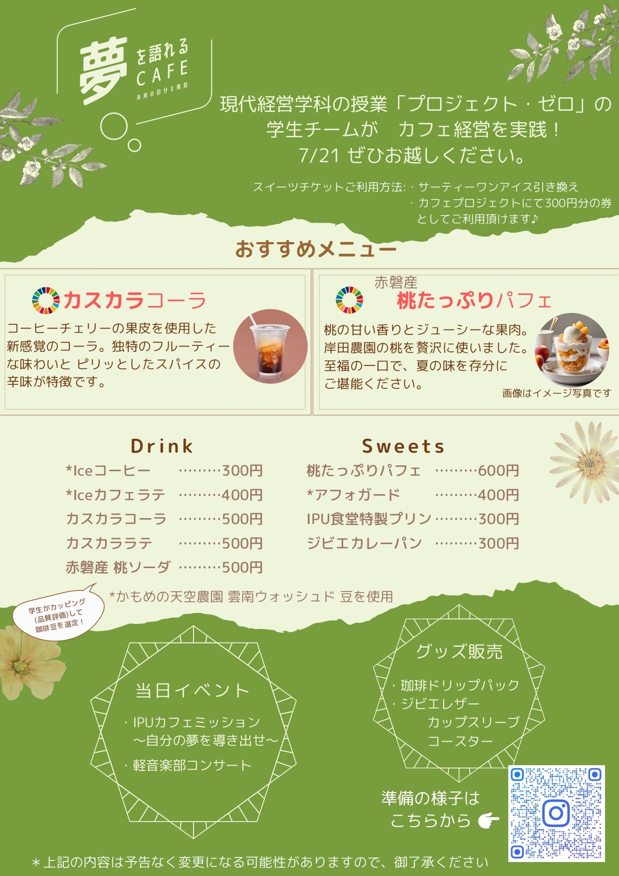 IPU・環太平洋大学・現代経営学科の学生が運営する「夢を語れるカフェ(以下、夢カフェ)」が7月21日(日)のオープンキャンパスに合わせて開店します。夢カフェの特徴は「学生主体の運営」「地域との連携」「グローバルな視点」「持続可能性への配慮」の4点。メニュー開発、イベント企画、会計、広報など、すべての工程を学生チームが担当し、地元・岡山の食材、農薬不使用・有機肥料使用のコーヒー豆、廃棄されるカスカラ(※)を活用したメニューを開発しました。厳選された「こだわりのコーヒー、スイーツ、軽食」をお楽しみください。