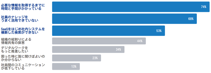 アシストとアイティメディア株式会社が共同で実施したアンケート調査では、勤務先での状況や課題について、SaaSを利用する企業の74%が「必要な情報の入手に時間と手間がかかっている」と回答しています。これは、検索パフォーマンスの向上やナレッジの共有、SaaSの横断検索が、さらなるBox活用のカギになることを示しています。