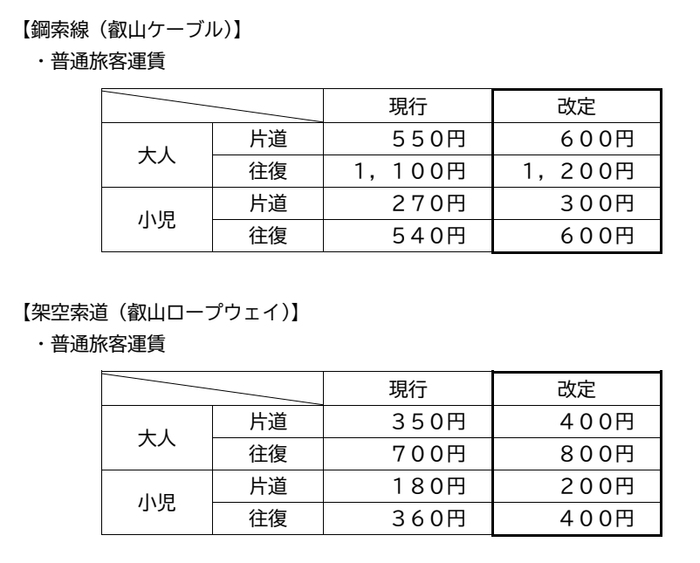これらを受けて本年4月1日(火)より、叡山ケーブル・ロープウェイの運賃を以下のとおり改定いたしますので、お知らせいたします。