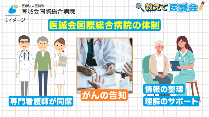 今回の動画では、医誠会国際総合病院で活動する「がん化学療法看護認定看護師」が、告知の場に同席し、患者さんの気持ちに寄り添いながら、どのように情報の整理や理解を支えているのかを紹介します。