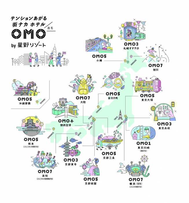 「OMO」は星野リゾートが全国に展開する街ナカホテルブランドです。ブランドコンセプトは「テンションあがる『街ナカ』ホテル」。地域と一体となって街を楽しみ尽くす旅を追求しています。全てのOMOで、街歩きをサポートするGo-KINJO(ごーきんじょ)サービスを展開。