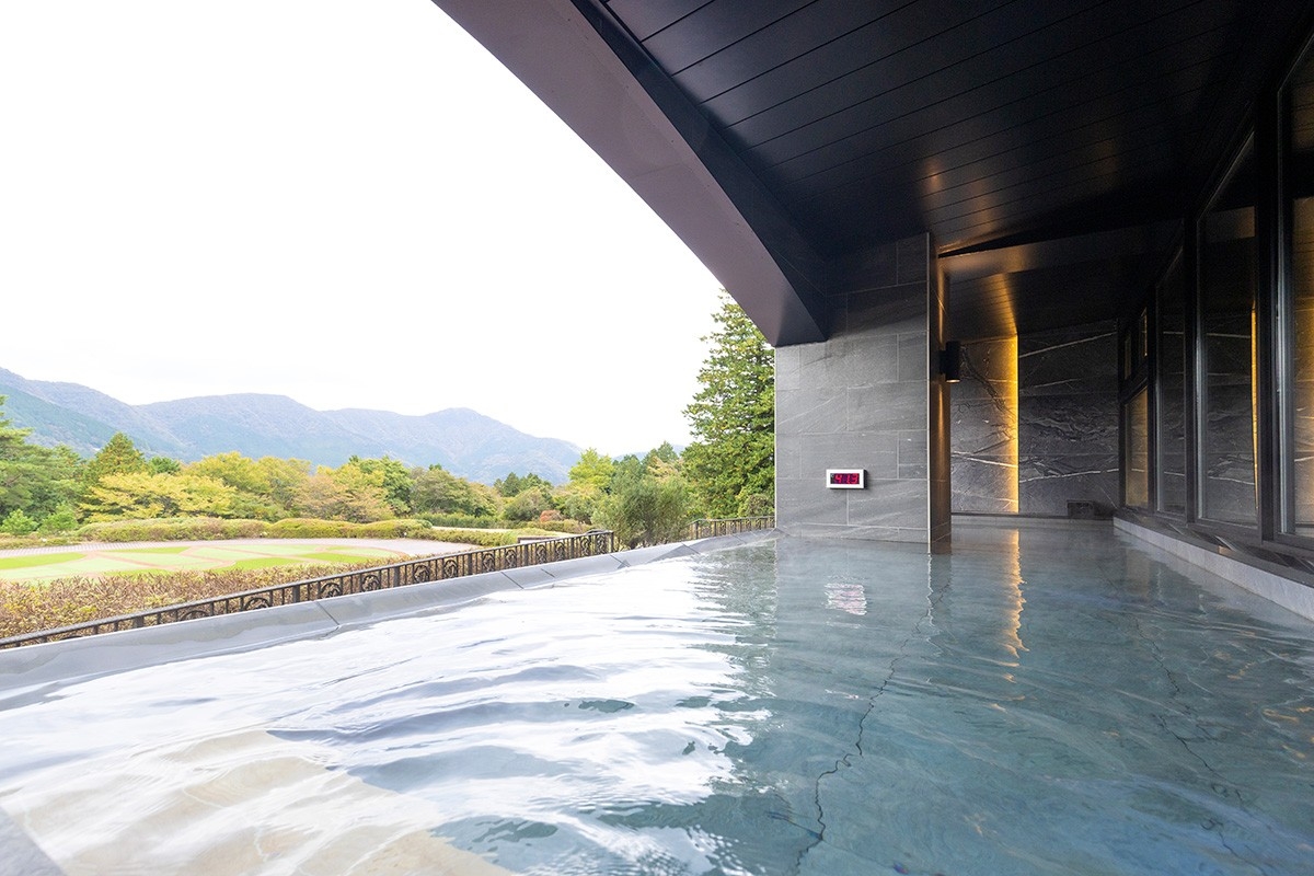 大きな窓から陽光が差し込む昼間、間接照明で趣を変える夜と、一日を通して移り変わる景観が楽しめる大浴場です。開放的な窓越しに広がる箱根の山々を眺めながら、ゆったりと温まるひと時を味わえます。落ち着きのある空間で、山々の自然を眺めながらゆったりと湯あみをご堪能ください。