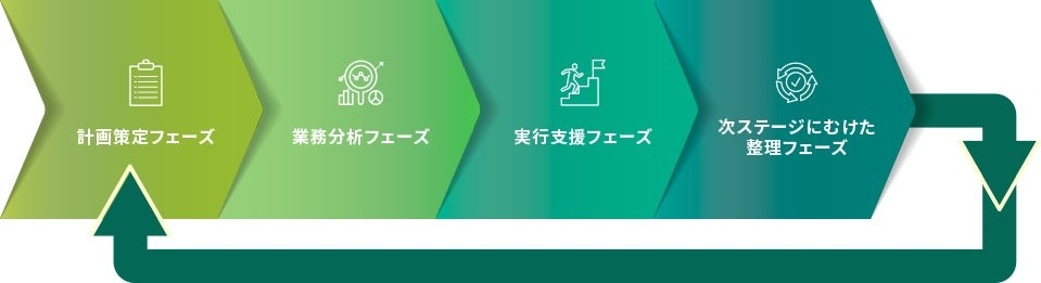 フェーズを4つに分けてコンサルティングいたします。まずはDXの目的を明確にし、実現可能な計画を策定した後、既存の業務プロセスを見直し効率化を図ります。そして、適切な技術の選定と導入プロセスの管理をご支援。さらには、取り組みの成果を評価し次のステージに向けた具体的な計画を策定いたします。貴社に合わせた成長戦略とデジタル戦略をMJSが一緒に描き、ビジネスの変革と成長を実現します。