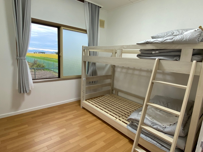 DIYで部屋をリフォームしたもう1棟は、ドミトリータイプ(相部屋)となっており、2段ベッドが3台(計6人)うち女性専用部屋が1部屋(2人)の部屋となっています。安く泊まりたい方、交流をされたい方などにおすすめです。こちらもリビング・キッチン・トイレ・風呂(シャワーのみ)は共用となります。
