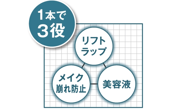 《リフトラップスプレー》はリフトアップ、メイク崩れ防止、美容液の3つ効果が1本になった機能性美容スプレーです。朝、シュっとひと吹きするだけで肌に透明ヴェールの膜ができ表面張力を与え、たるみ肌をキュっと引き締めます。また、皮脂、汗をブロックすることで化粧崩れも防止します。さらに、エイジング成分エイジフィニティーをはじめとする15種類の美容成分が肌にハリと艶を与えます。