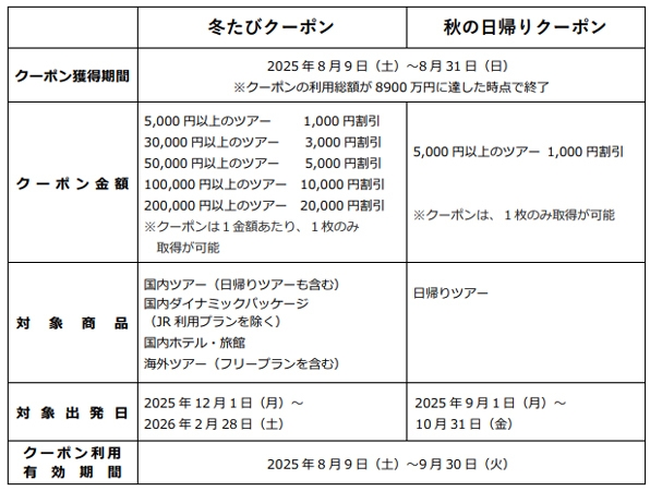 クーポンは、12月1日※1から2026年2月28日までの出発日に使用可能で、本キャンペーンにより、国内旅行、海外旅行の需要喚起を図ります。
