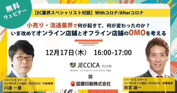 図書印刷株式会社は、小売り・流通業界の動向に関する無料ウェビナー(オンラインセミナー)を、来る12月17日(木)に一般社団法人ジャパンEコマースコンサルタント協会(JECCICA)よりお二方をお迎えして対談形式で実施いたします。