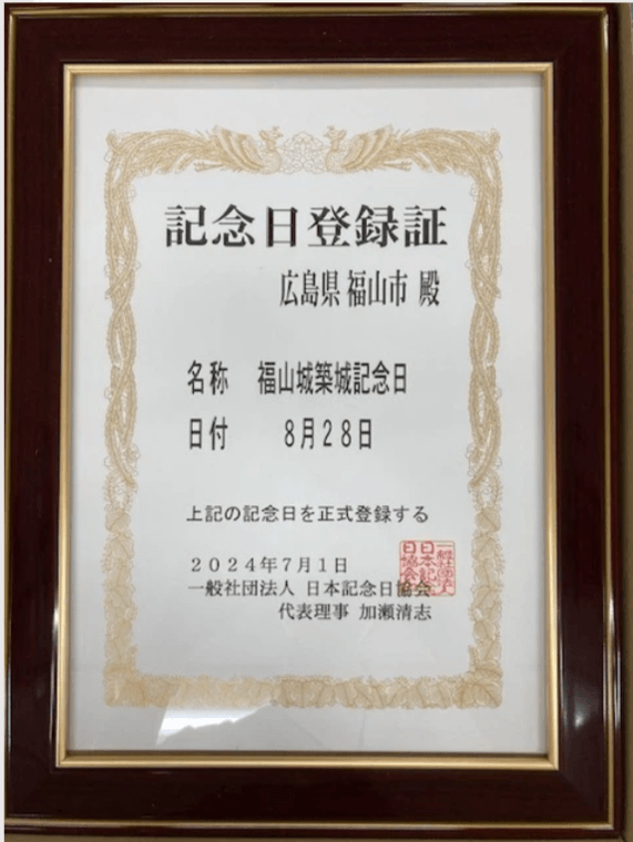 福山市は、福山藩初代藩主 水野勝成が、福山城の完成を幕府に報告した日とされる8月28日を「福山城築城記念日」として登録しました(一般社団法人日本記念日協会認定)。築城した日を一般社団法人日本記念日協会に登録したのは、福山城が全国で初めてになります。