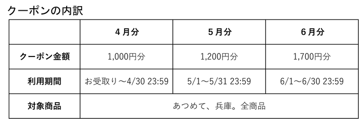 合計3,900円分のクーポンは利用対象月ごとにクーポン金額がステップアップし、4月利用可能クーポンは1,000円分、5月利用可能クーポンは1,200円分、6月利用可能クーポンは1,700円分と大変お得な内容となっております。ぜひこの機会に、当ショップでのお買い物をお楽しみください。あつめて、兵庫。 ショップTOP