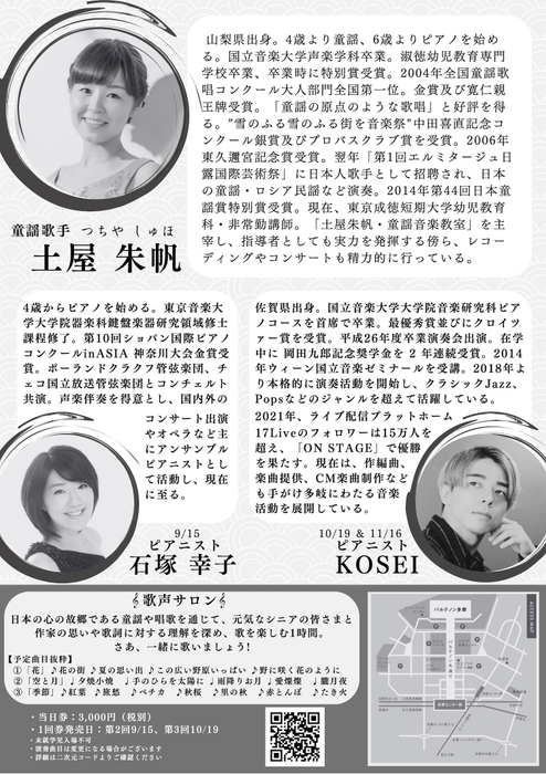 日本の心の故郷である童謡や唱歌を通じて、皆さまと昭和歌謡や童謡・唱歌を楽しむことで、音楽ホールに集う楽しみを発見していただき、引き篭もり防止や社会とのコミュニケーションを図る場を継続的に創出していきたいと考えています。