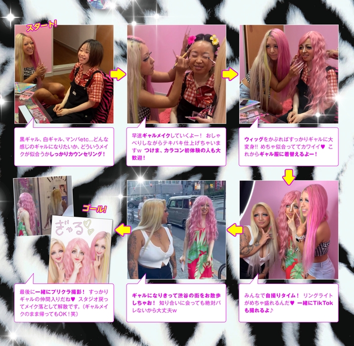コース内容は【カウンセリング→ギャルメイク→ウィッグ&ネイル&ギャル服レンタル→自撮りタイム→渋谷散歩→プリクラ撮影】という合計約100分の内容になっています。