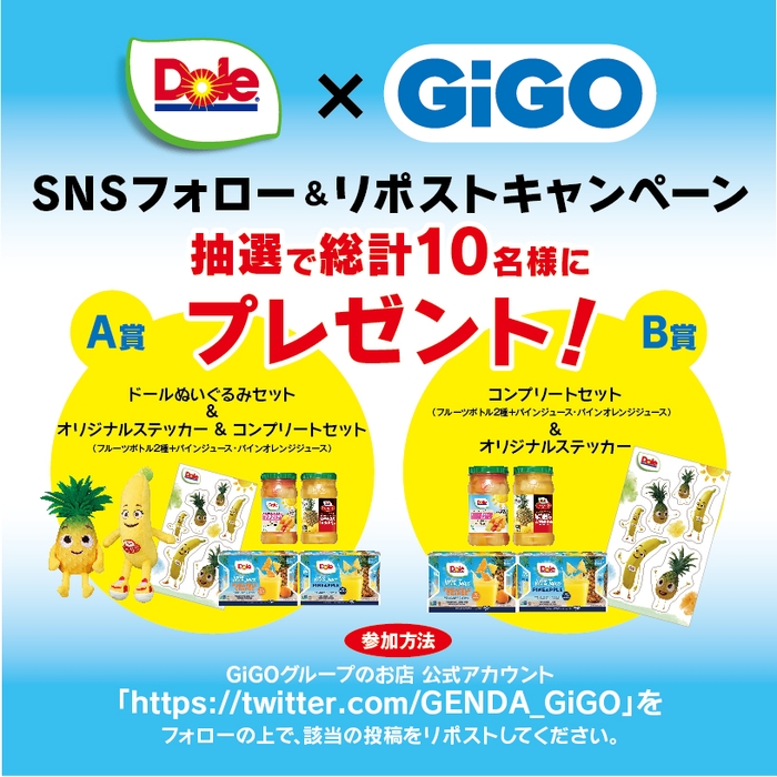 Xアカウント(https://twitter.com/GENDA_GiGO )をフォローの上、該当の投稿をリポストされたお客さまの中から抽選で総計10名さまに、ドールのコンプリートセット(フルーツボトル2種+缶ジュースシュリンクパック2種)とオリジナルグッズを組み合わせてプレゼント!