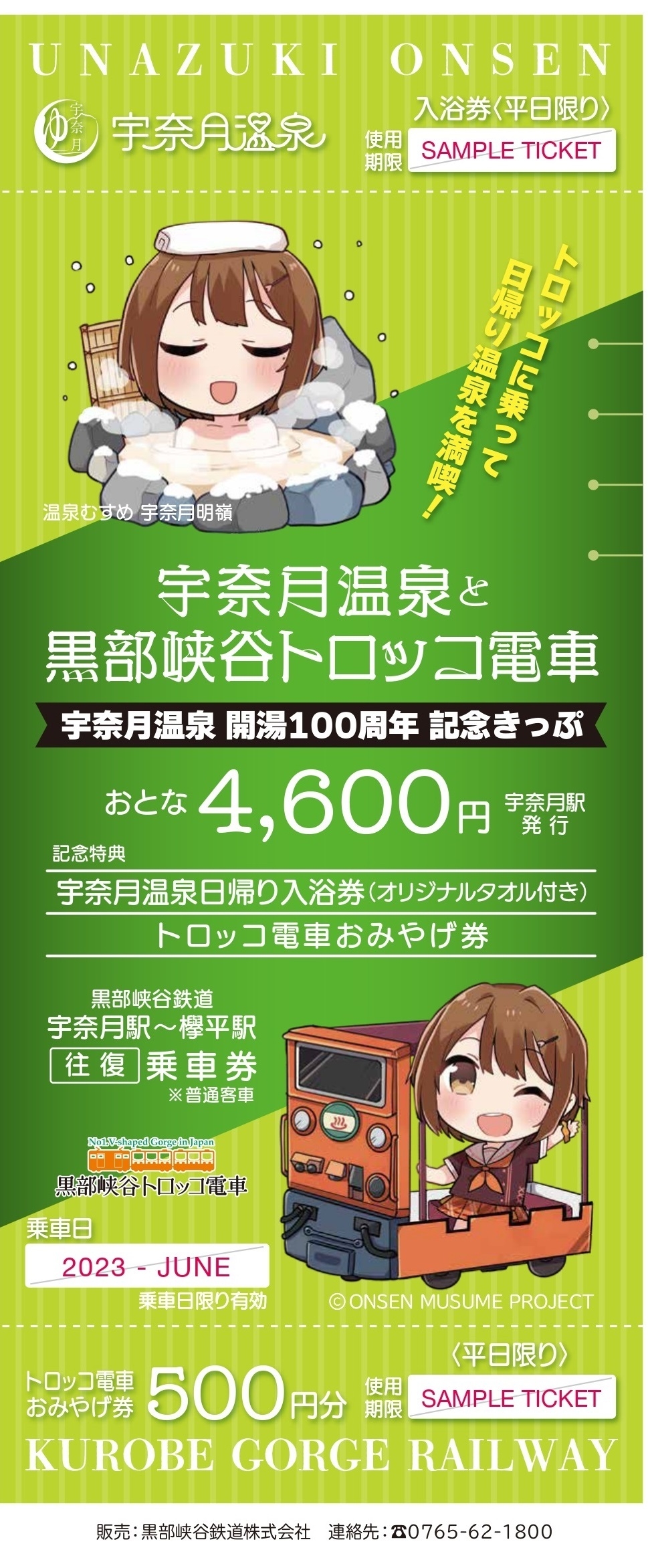 今回の記念きっぷには、「温泉むすめ」キャラクターのひとり「宇奈月明嶺(うなづきあかね)」をあしらい愛らしいデザインに仕上げました。販売および利用期間は6月の平日、黒部峡谷鉄道「宇奈月駅」窓口で販売いたします。富山県おみやげポイントでの購入も可能です。