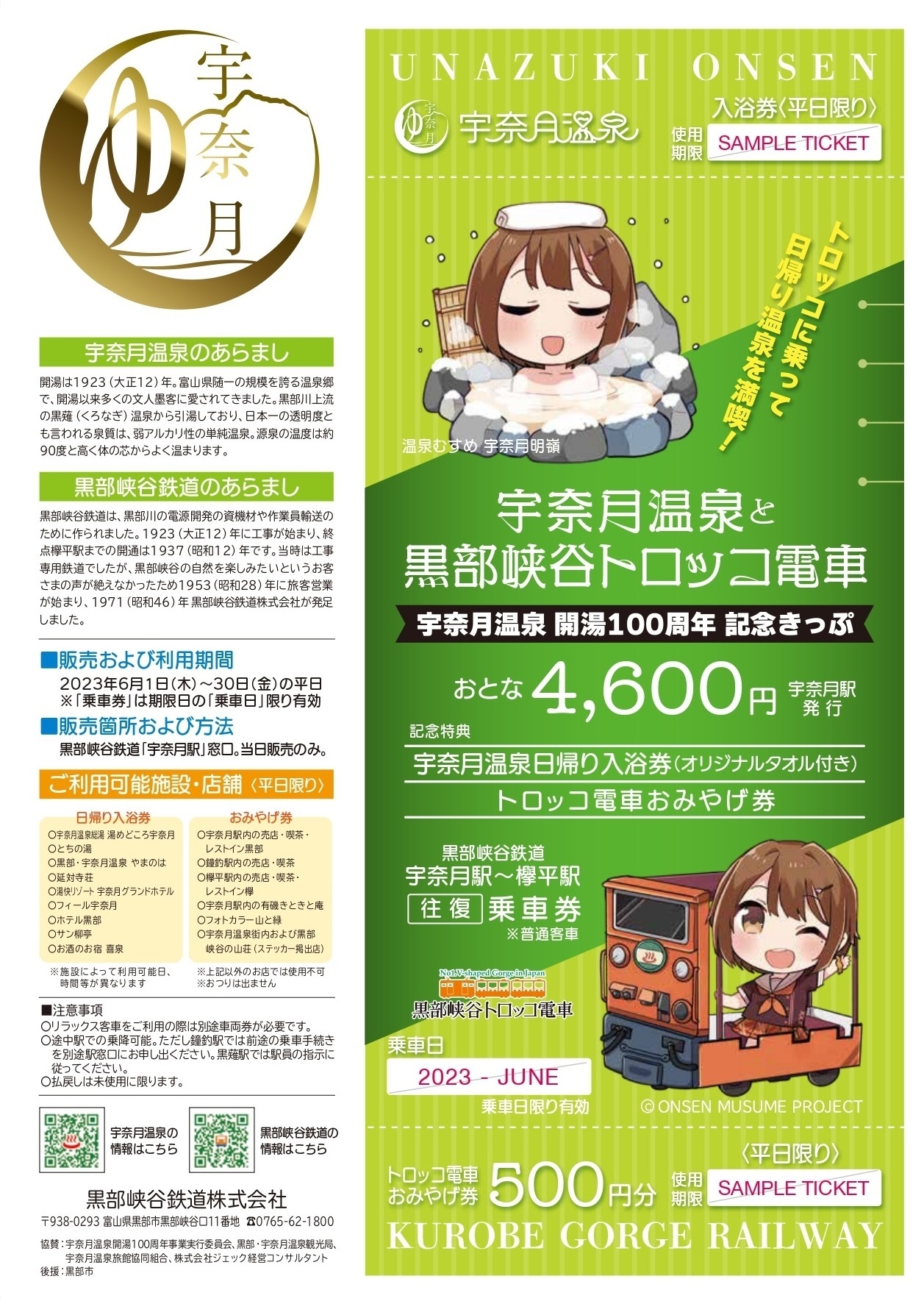 黒部峡谷トロッコ電車(運営:黒部峡谷鉄道株式会社、所在地:富山県黒部市、代表取締役社長:鈴木 俊茂)では、宇奈月温泉開湯100周年を記念して、トロッコ電車の「乗車券」と、宇奈月温泉街の日帰り「入浴券」、さらに峡谷沿線の売店・レストランや宇奈月温泉街で使える「おみやげ券」をセットにした、「宇奈月温泉開湯100周年記念きっぷ」を発売いたします。