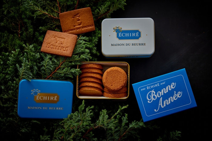 エシレ・パティスリー オ ブール<渋谷・新宿・名古屋・横浜・池袋>では、ボナネ デザインの「サブレ グラッセ」を発売いたします。美しい青色の缶に白色で“BONNE ANNÉE”の文字を施した、1900年代のフランスを思わせるクラシカルなデザインは、思わずコレクションしたくなるような佇まい。サクサクのバター サブレに、エシレ バターと砂糖で仕上げた糖衣を贅沢にかけた「サブレ グラッセ」は、口いっぱいに芳醇なバターの美味しさが広がります。サブレに描かれた「É」のロゴと、牛のモチーフも愛らしく、1枚ずつ個包装なので、ホームパーティーや帰省土産など、みんなで分けるシーンにもおすすめの一品です。