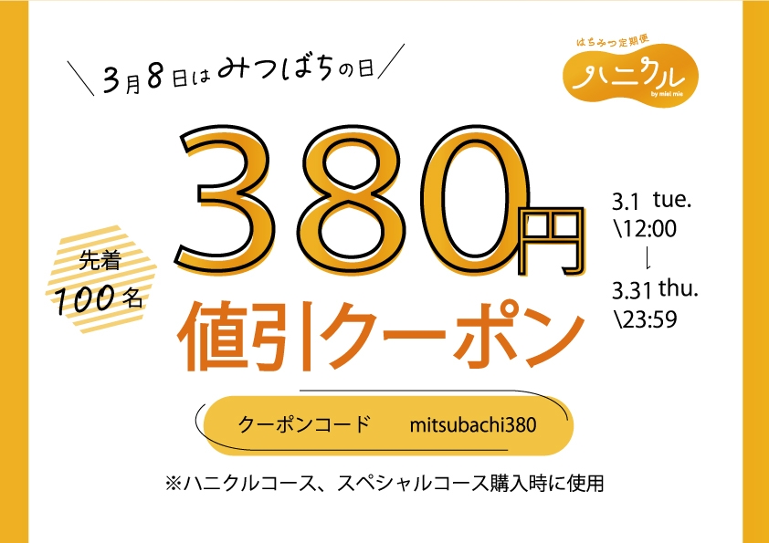 みつばちの日を記念して、新規購入者対象の3月限定値引クーポンを発行いたします。