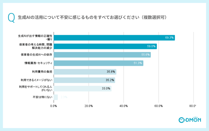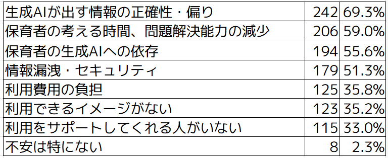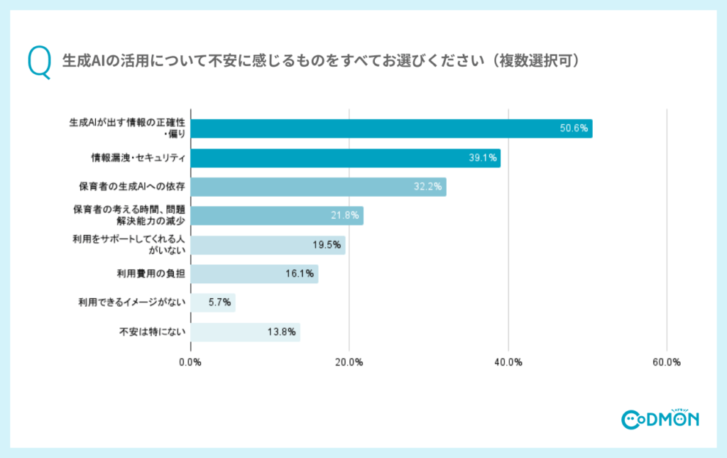 生成AIを利用している方がもっとも不安に感じているのは「生成AIが出す情報の正確性・偏り」で50.6%という結果でした。次いで「情報漏洩・セキュリティ」が39.1%、「保育者の生成AIへの依存」が32.2%があげられました。