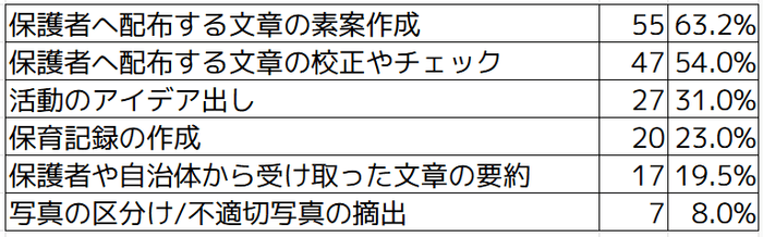 「保育記録の作成」が63.3%ともっとも多く、次いで「写真の区分け/不適切写真の摘出」が32.7%という結果となりました。その他としては「抵抗はないがイメージがわかない」や「指導案や保育計画の作成」などがあげられました。