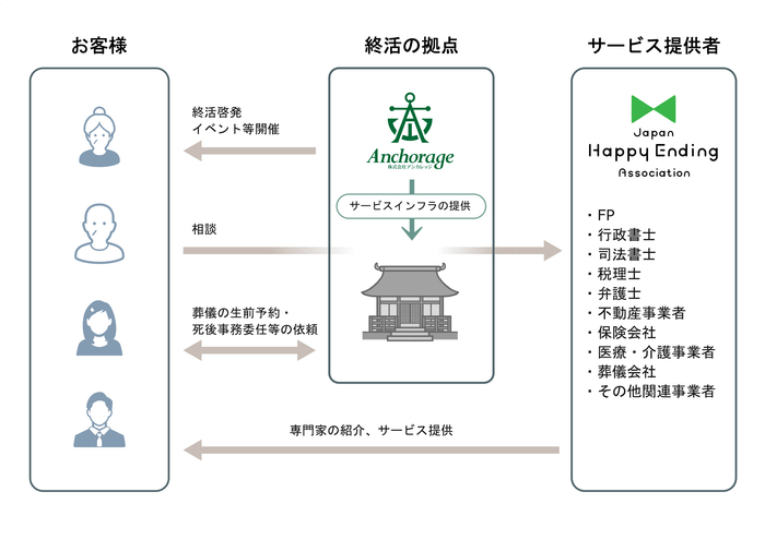 日本Happy Ending 協会は、各士業をはじめ、ファイナンシャルプランナー、医療や葬祭関連企業に至るまで幅広い事業者との連携に取り組んでおり、超高齢化社会に伴う広範な問題の包括的サポート体制を整えています。アンカレッジ、寺院、そして日本Happy Ending協会の連携により、寺院を拠点とした終活に関するワンストップサービスの提供が可能となりました。