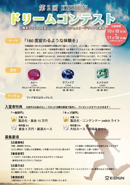 再生宝石(アップサイクルジュエリー)事業を行う株式会社貴瞬(本社:東京都台東区、代表取締役 辻 瞬、以下 当社)は、若い力が活躍するきっかけづくりの一環として、ジュエリーのデザインを募集する『KISHUNドリームコンテスト~180度変わるような体験を~』のデザイン募集を2023年10月10日(火)から開始します。