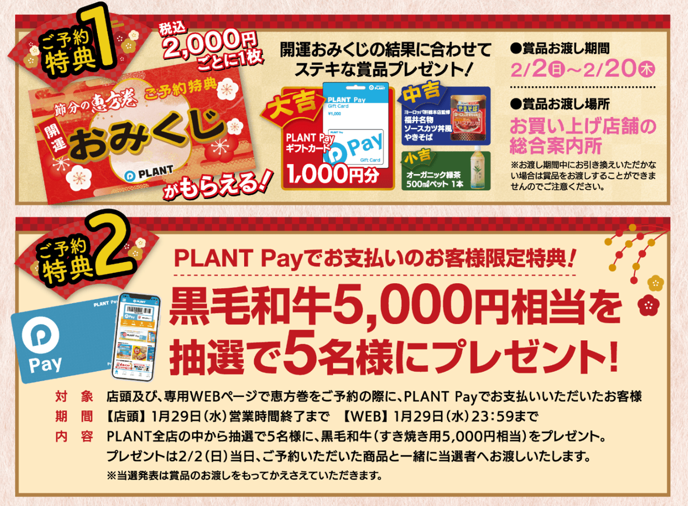 ご予約特典として、税込2,000円ごとに1枚、ステキな賞品がもらえる開運おみくじをプレゼント!さらに2025年は、PLANT Payでのお支払いで、黒毛和牛5,000円相当が抽選で5名様に当たるチャンスもございます。