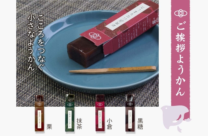 「お世話になりました」のメッセージが入った小さなようかん。栗・抹茶・小倉・黒糖の4つの風味でお楽しみいただけます。