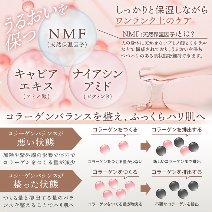 肌に元々備わっているNMFを効率よく補うアミノ酸を多く含んでいるキャビアエキスとナイアシンアミドの効果でお肌の保湿だけでなく、バリア機能も強化。