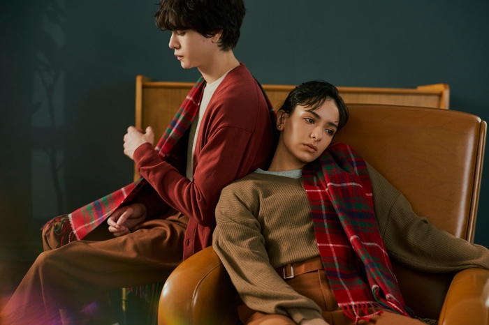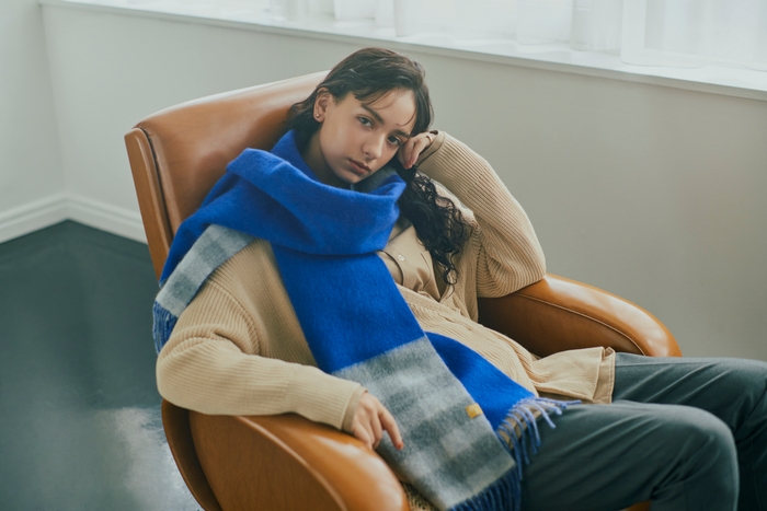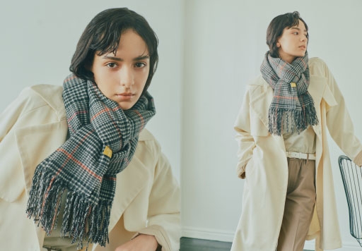 プレーンなトップスに組み合わせるだけで、単純なスタイリングでも様になるストール。