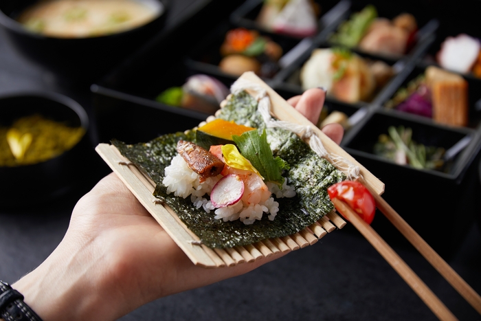 「手織り寿し」をお手軽にお楽しみいただける折詰め弁当です 。十五穀米と京都千鳥酢で仕立てたシャリや約40種類の食材、付属の焼き海苔 、特製調味料を織りまぜ ながら 、ご自身だけの味の組み合わせをぜひご賞味ください。
