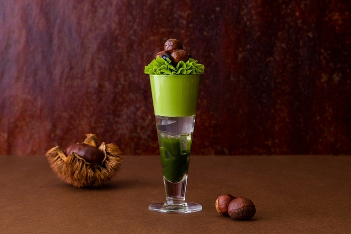 ほのかな苦味を感じる抹茶クリームがアクセントとなり栗の素朴さを引き立て、中に白桃、赤エンドウ、白玉、水まんじゅうとわらび餅、抹茶蜜を忍ばせた、お茶の彩り豊かなパフェです。