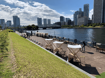 テラスの手すりやテーブルを活用したポータブルカウンター「mizube bar」が川沿いに登場。隅田川の美しい景色を眺めながら、ゆったりと飲食を楽しめます。