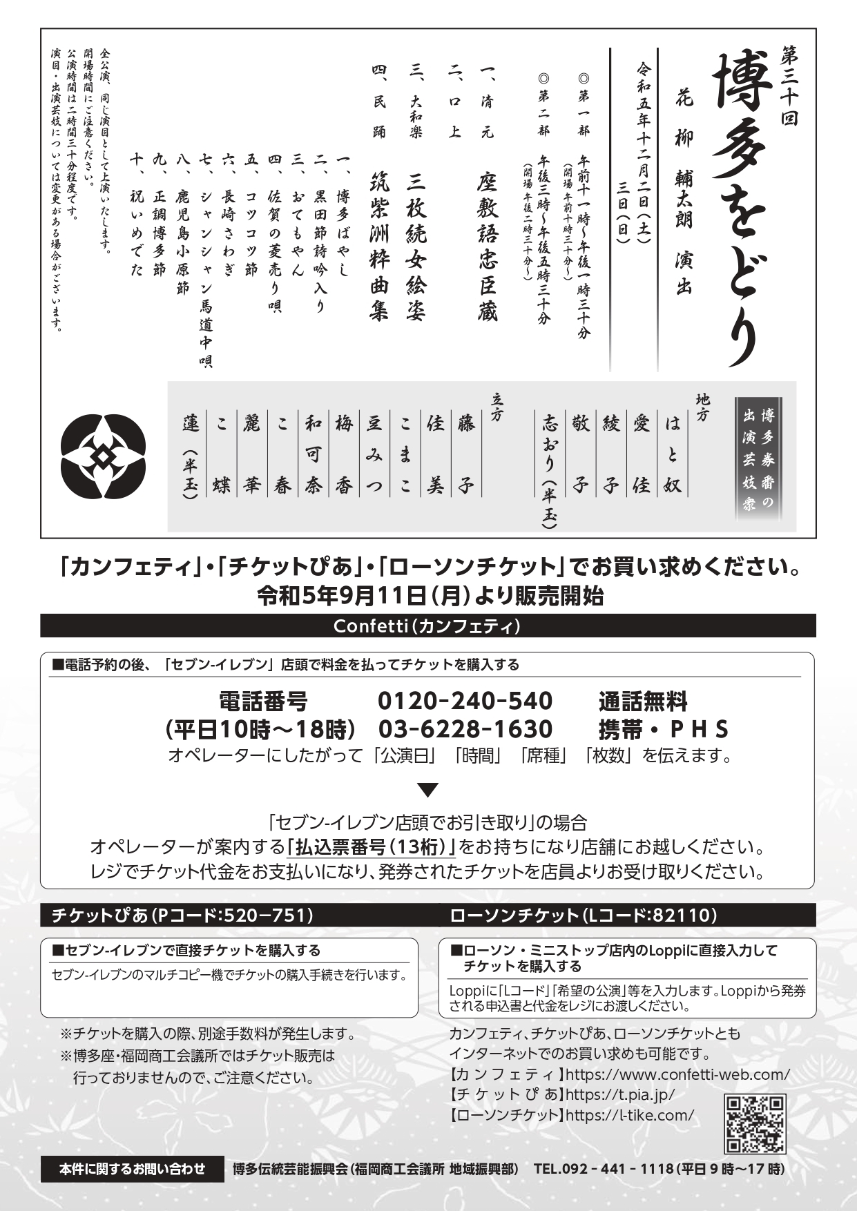 博多伝統芸能振興会主催、「特別記念公演『第三十回 博多をどり』」が2023年12月2日 (土) ~2023年12月3日 (日)に博多座(福岡県福岡市博多区下川端町2-1)にて開催されます。