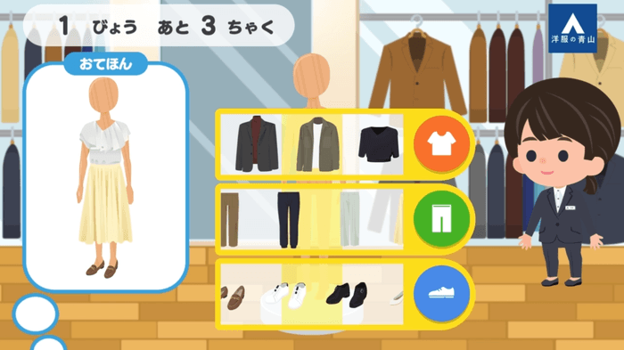 アプリ内店舗では、青山商事が実施する不要になった衣料品を店頭回収しリサイクル・リユースする活動を反映させ、お客様が持ち込んだ商品の数を数えてクーポン券を渡す「リサイクル」に加えて、お手本と同じようにマネキンに商品を着せる「コーディネート」、商品のお直しをする「おなおし」の3種のゲームをお楽しみいただけます。
