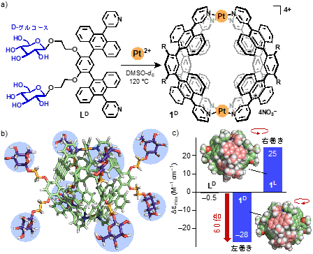 本研究ではまず、2つの単糖(D-グルコース)を導入した有機配位子LD(図2a左)を合成しました。この配位子は2つのアントラセン環と2つのピリジン環を含む湾曲型の芳香環骨格を持ちますが、らせん構造を取らないため円二色性(CD)スペクトル(用語5)のバンド強度はほぼゼロです(図2c)。配位子LDと白金イオンを約2:1の比率で有機溶媒(DMSO)に加えて、その溶液を加熱・攪拌することで、外面が単糖で修飾された、目的生成物の4重らせん型カプセル1Dが定量的に生成しました(図2a右)。核磁気共鳴装置(NMR)と質量分析装置(MS)、理論計算により、このカプセルは4つの配位子と2つの金属イオンから成り、外面に8つの単糖を持ち、内部に1.3nmサイズの空間を有する球状構造体(図2b)であることを決定しました。らせん構造はCDスペクトルで判明しました。得られた白金架橋カプセル1Dは、約380nmにアントラセン環に由来する強い負のCDバンドを示しました。その強度は同濃度のLDと比較して60倍以上に向上しました(図2c)。このことから、カプセル形成による芳香環骨格の集合で、側鎖の単糖からカプセル骨格へのキラル伝達が生じ、片巻のらせん構造が誘起されたと考えられます。D-グルコースで修飾されたカプセル1DはNMRと理論計算から、85%以上の選択性で「左巻き」らせんであることが示されました。らせんの方向は単糖の種類で調整することが可能で、L-グルコースで修飾されたカプセル1Lは「右巻き」を示しました(図2c)。