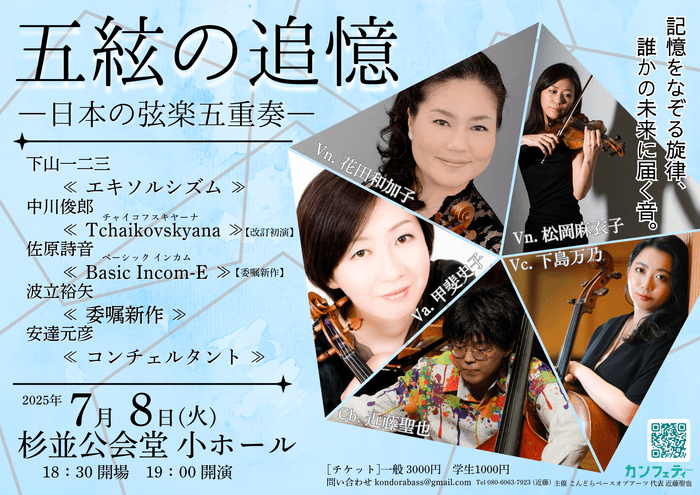 こんどらベースオブアーツ『五絃の追憶 — 日本の弦楽五重奏』が2025年7月8日 (火)に杉並公会堂 小ホール(東京都 杉並区 上荻 1-23-15)にて開催されます。
