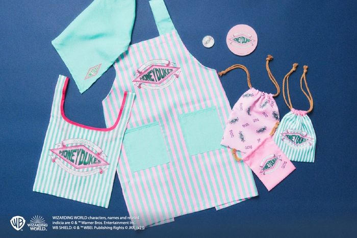 ホグワーツ魔法魔術学校の生徒たちも大好きなお菓子屋さん「HONEYDUKES」をモチーフにした子供用エプロンや巾着袋