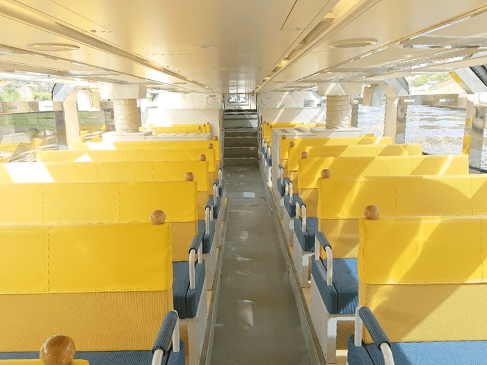 水都大阪の定番クルーズ「アクアライナー」は、屋根付き、冷暖房完備の船で、どんな天候の日でも快適に過ごせるように造られた船です。