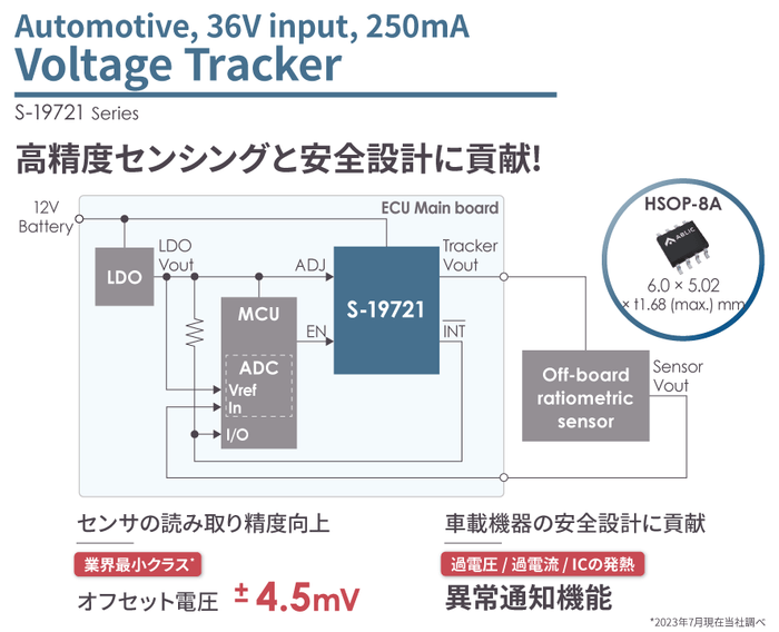 本日発売したボルテージトラッカ「S-19721シリーズ」は、業界最小クラス(※1)のオフセット電圧で、ECU外部のセンサ類や部品へ電源を供給する際に、正確なセンサ読み取りを実現することができます。また、本シリーズは250mAまで出力可能なため、センサの高機能化で大電流出力が求められる、あるいはセンサの搭載個数が増加して複数のセンサをまとめて電源を供給する、といった用途にもご使用いただけます。