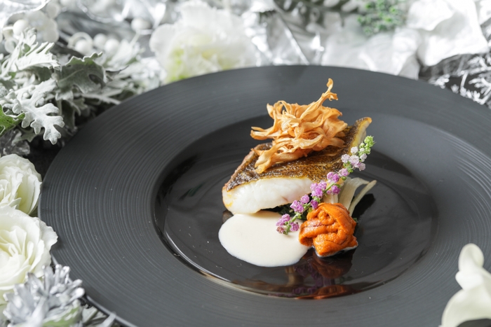 濃厚でコクがある北海道産雲丹が楽しめる一品。皮をかりっと焼き上げた寒平目と、酸味を効かせた魚介出汁と白ワインのソースと共に。ホワイト舞茸を添え、冬の北海道をイメージしました。