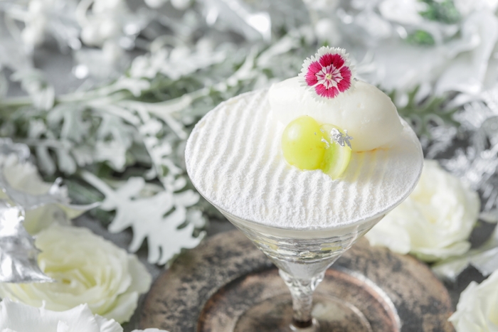 冬の高原をイメージしたパフェ。さっぱりとしたチーズと日本酒のジュレで、上品に仕上げました。塩ミルクアイスと共にお楽しみください。