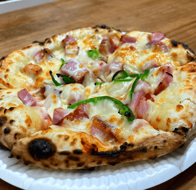地元食材を使ったピザが人気のキッチンカー「サリチェ」と立命館大学ぎゅっと滋賀メンバーが考えたオリジナルピザ。滋賀県立長浜農業高等学校の生徒が作る味噌やコチュジャン、ソーセージを使ったピザもあります。