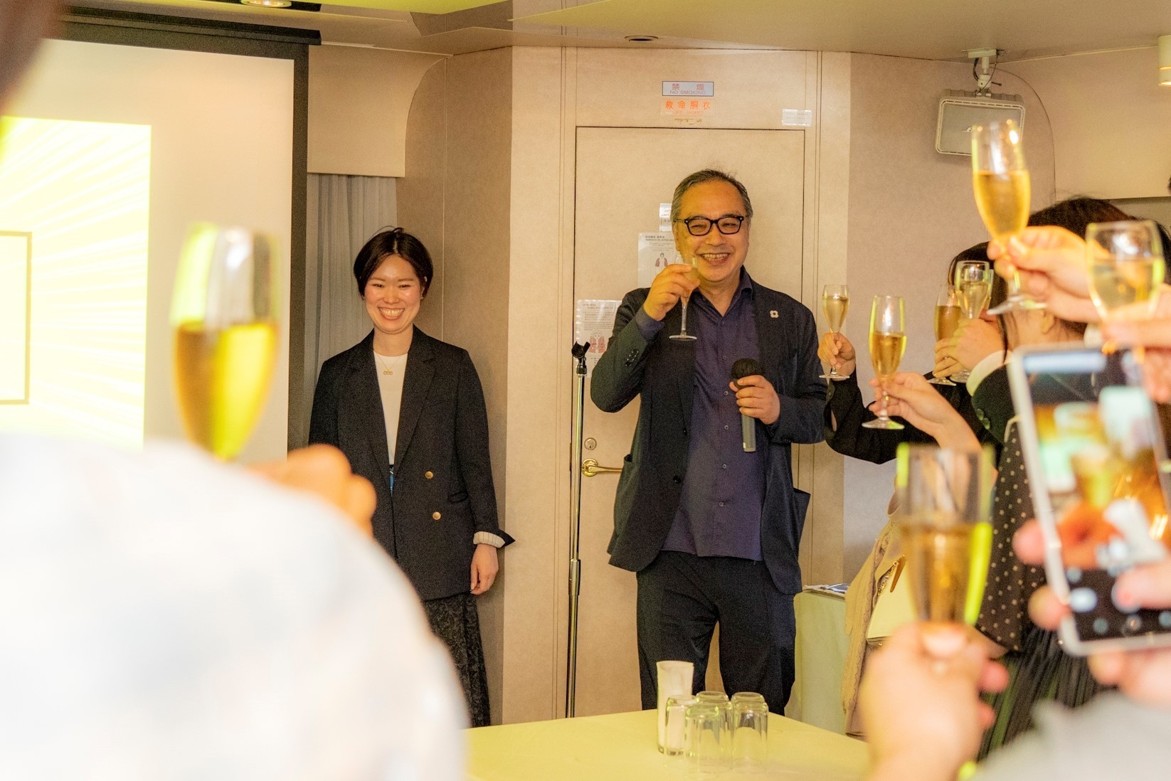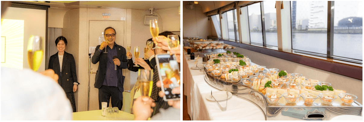 イベント後半はついにクルーズ船に乗り込み、東京湾クルージングがスタート。大黒屋代表取締役社長・小川から「コロナ禍で閉じこもりがちな学生生活だったかと思います。今回は皆さんに喜んでもらえればと思い、弊社として最高のおもてなしを用意しました。クルーズ船の時間を楽しんでください」と、乾杯のご挨拶を行いました。