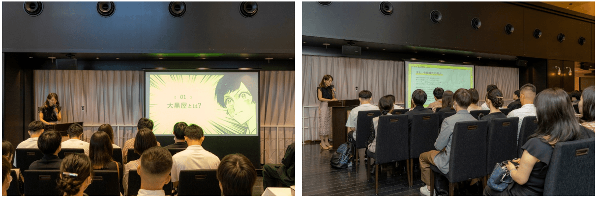 求める人物像、給与・福利厚生、選考フローについてもお話しし、「当社は世界NO.1を本気で目指しています。その実現のためには、これからの時代をつくる皆さんの若い力が必要です。そして、大切なのは『やる気』です。失敗を恐れることなく、積極果敢にチャレンジし、自らのアイデアを形にしていく姿勢があれば、大黒屋には活躍できる土壌があります。知識やスキルを柔軟かつ貪欲に吸収して、新しい価値をともに生み出していきましょう」と締めくくりました。
