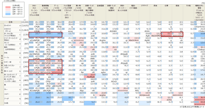 ただし、統計的有意差は考慮せず色付けされています。(回答母数が30ss以上のものに限る)