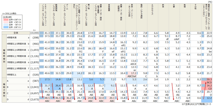 (寝室での行動×睡眠時間・睡眠の質ランク)