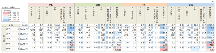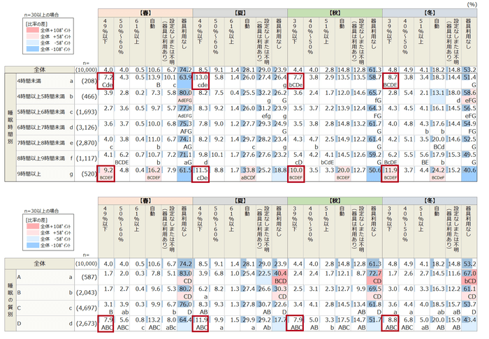 特に春は7割以上が非利用で、湿度環境と睡眠の関係性をみると、睡眠時間が極端に短い人(4時間未満)や長い人(9時間以上)、また睡眠の質が悪い人(睡眠の質D判定)は、設定湿度が低い傾向にありました。